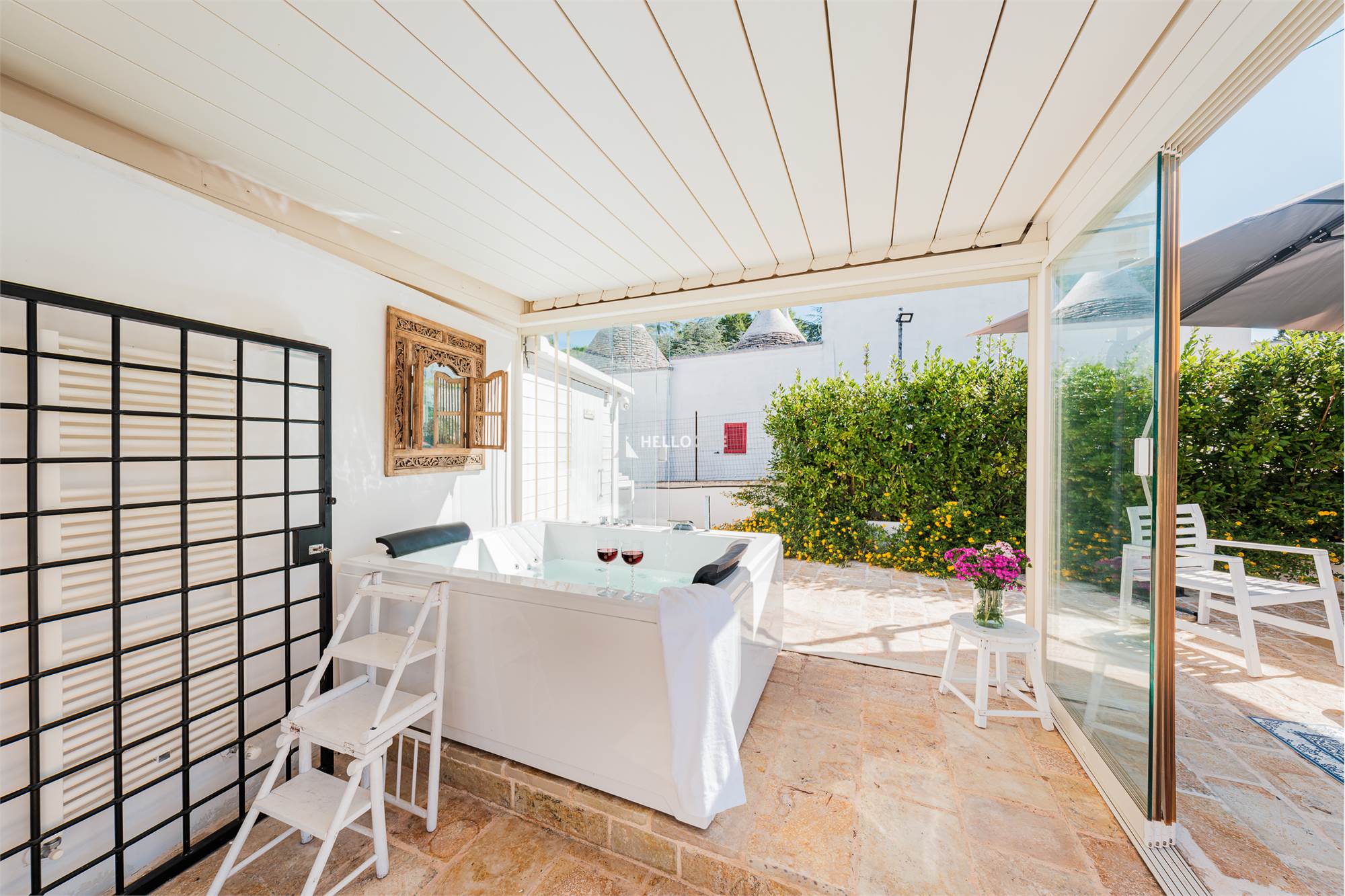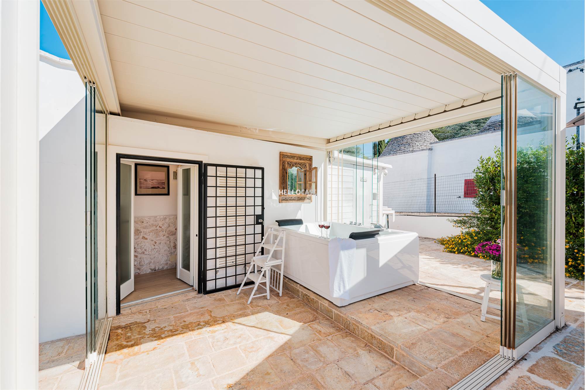 A standout feature is the spa room, a luxurious glass-walled space with views of the pool and garden, offering the perfect environment to relax and unwind immersed in nature. The jacuzzi bathtub in the room ensures moments of absolute well-being and tranquility.