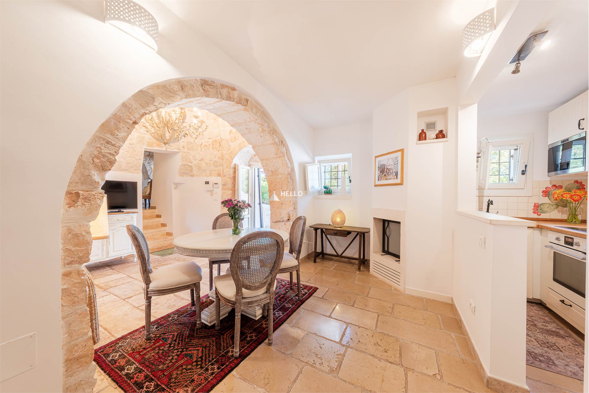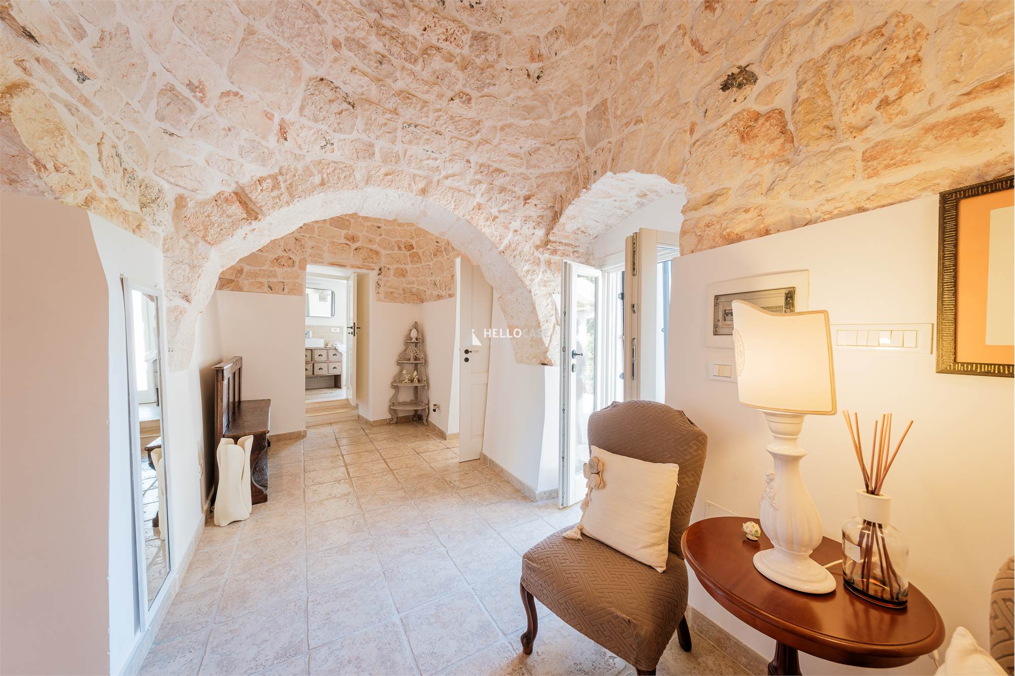 This unique property consists of a labyrinth of 5 conical trulli and a lamia, connected by steps that divide the living area from the sleeping area, creating a mystical yet warm and welcoming atmosphere. The interior retains its rustic charm with vaulted ceilings and exposed stone – a truly one-of-a-kind experience to enjoy!