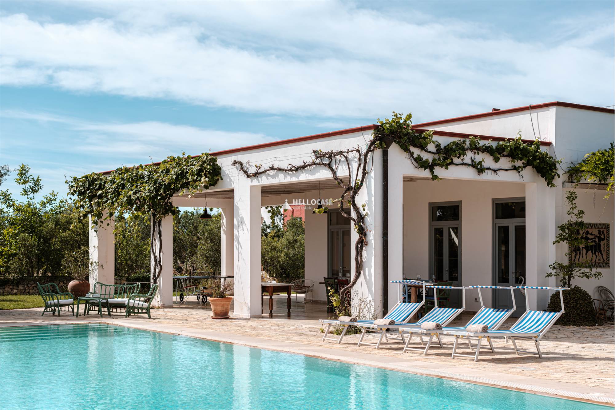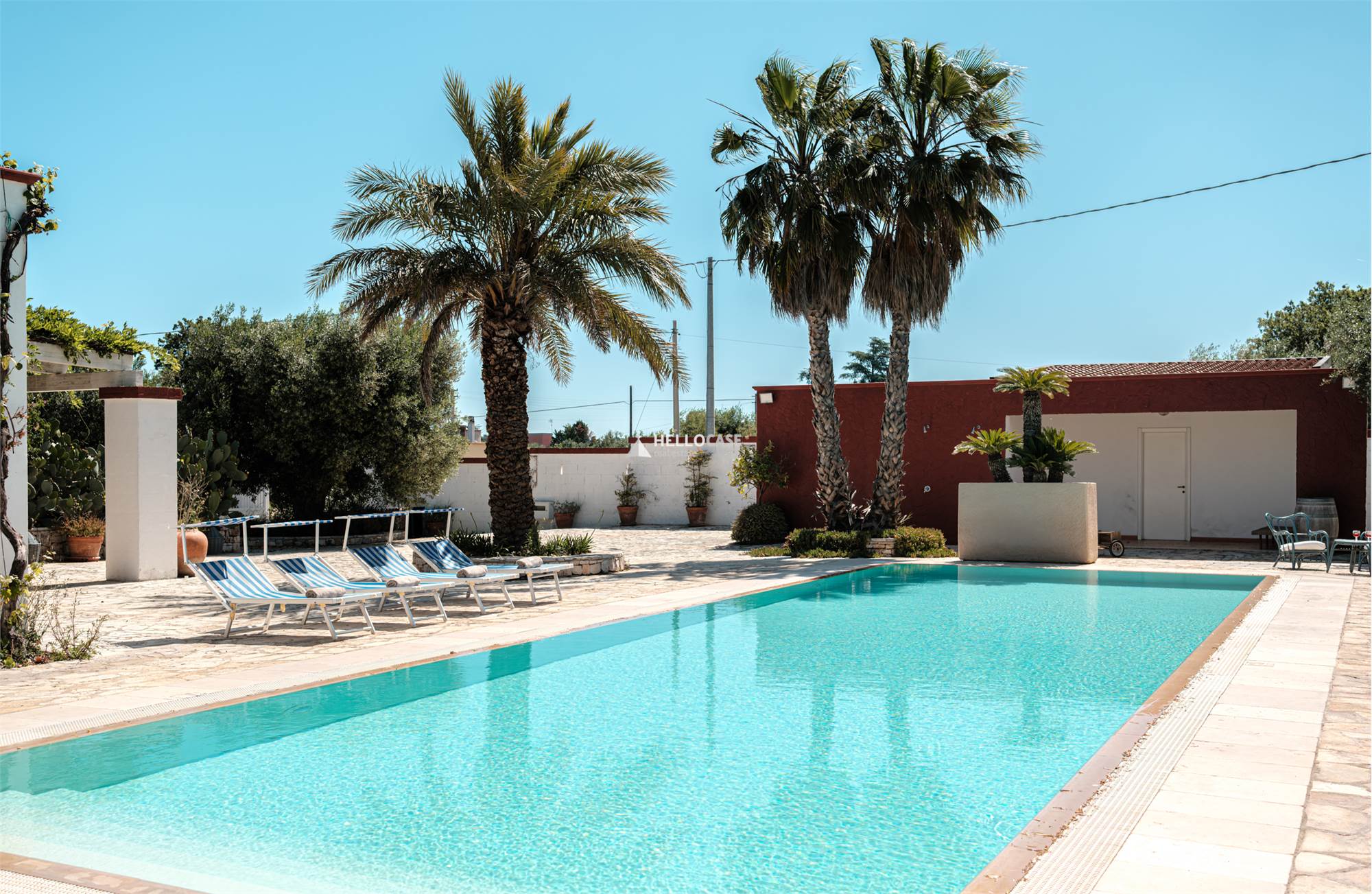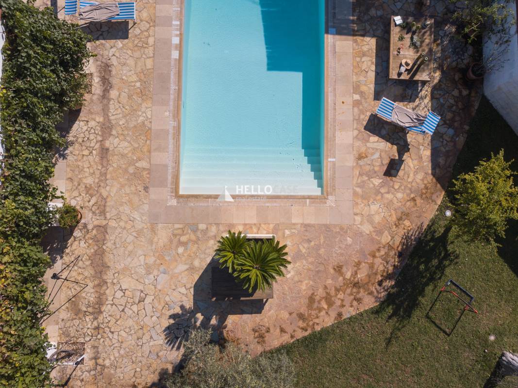 Questa villa con piscina in vendita, offre un giardino importante e ricco di piante tipiche mediterranee e la cui zona esterna a completamento della grande piscina privata (14x7mt e profonda fino a 3,5mt) è arredata con molto gusto.